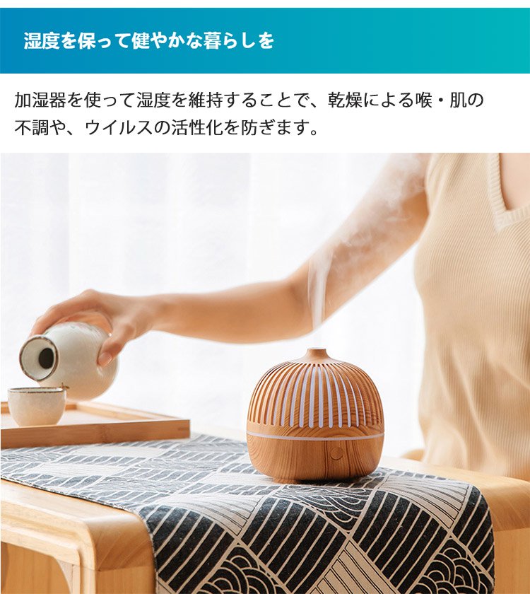 【卓上式アロマ加湿器】癒しの空間を演出する、おしゃれなアロマ加湿器。 アロマ対応、超繊細ミスト、自動停止機能 加湿量調節可能、7色LEDライト、静音設計